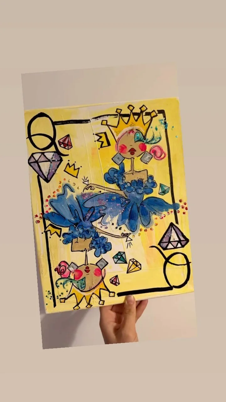 She encourages low-hanging artwork to inspire even the youngest of artists. Her work is characterized by bright colors, up-cycled materials, gems, glitter, and other found objects. Coated in resin, her work is designed to create long-lasting, durable pieces.
